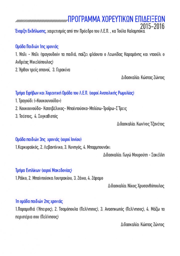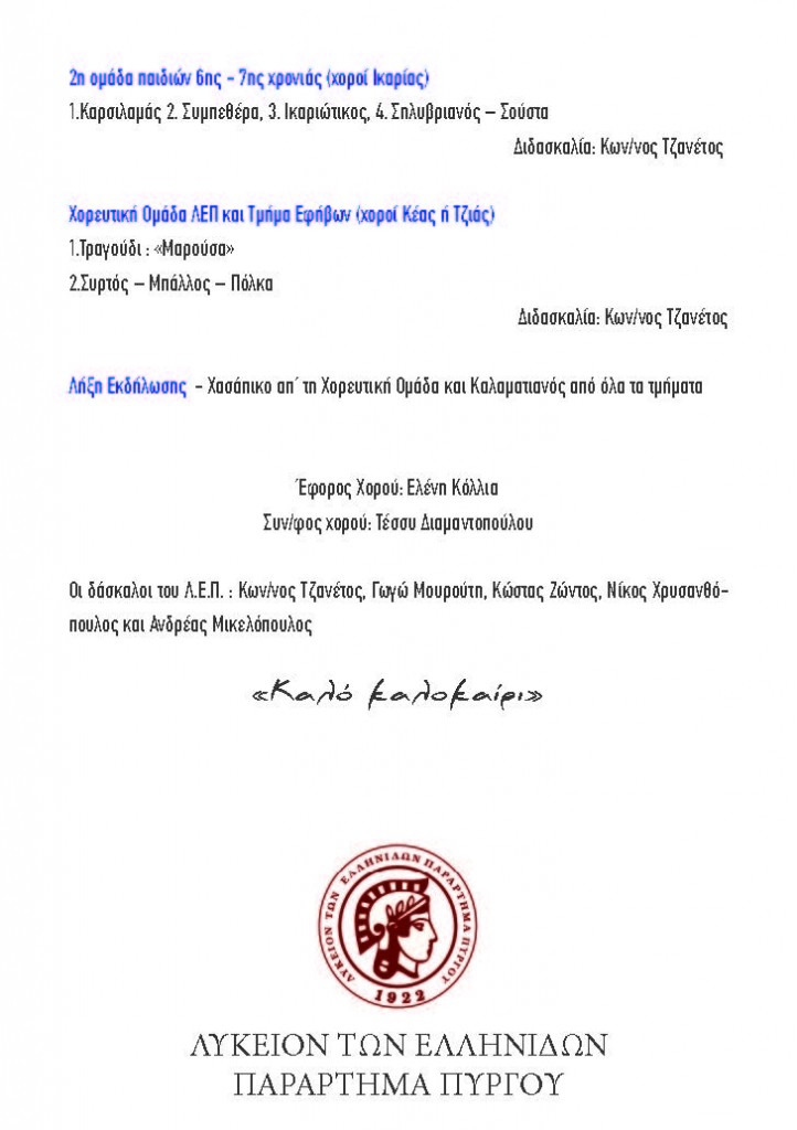 Συγχαρητήρια από καρδιάς στα παιδιά και στους δασκάλους μας Κων/νο Τζανέτο, Γωγώ Μουρούτη, Κώστα Ζώντο, Νίκο Χρυσανθόπουλο και Ανδρέα Μικελόπουλο. Ευχαριστούμε όλους τους γονείς που είστε μαζί μας σε αυτή τη προσπάθεια. Ευχαριστούμε όλους τους συμπολίτες μας που παρακολουθησαν μαζί μας αυτή την εκδήλωση.